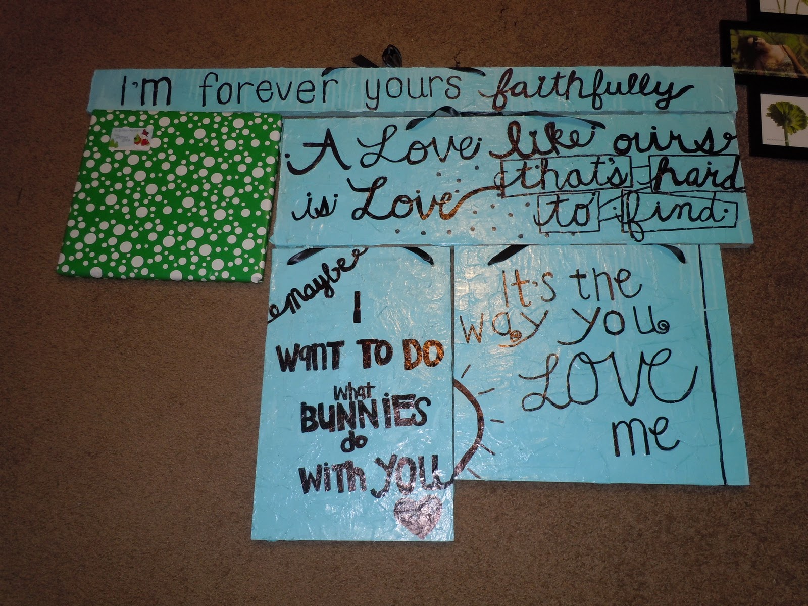 I got pretty frustrated with all of this work and had to take a lot of pictures in between. so hence... all of these pictures. Randy and Julie's was "If you leave me now" by Peter Cetera. Josh and Emily's was "this kiss" by Faith. Melissa Ann didn't give me one, so I put one of my favorite love song lyric for them... "faithfully" by Journey. and Kellen and Melissa's was "Smother Me" by the Used. the last empty square on the bottom was suppose to be ours. but, as I said... I was pretty exhausted. There was many double trips to the stores, and mod podge is now officially NOT my favorite thing to do.